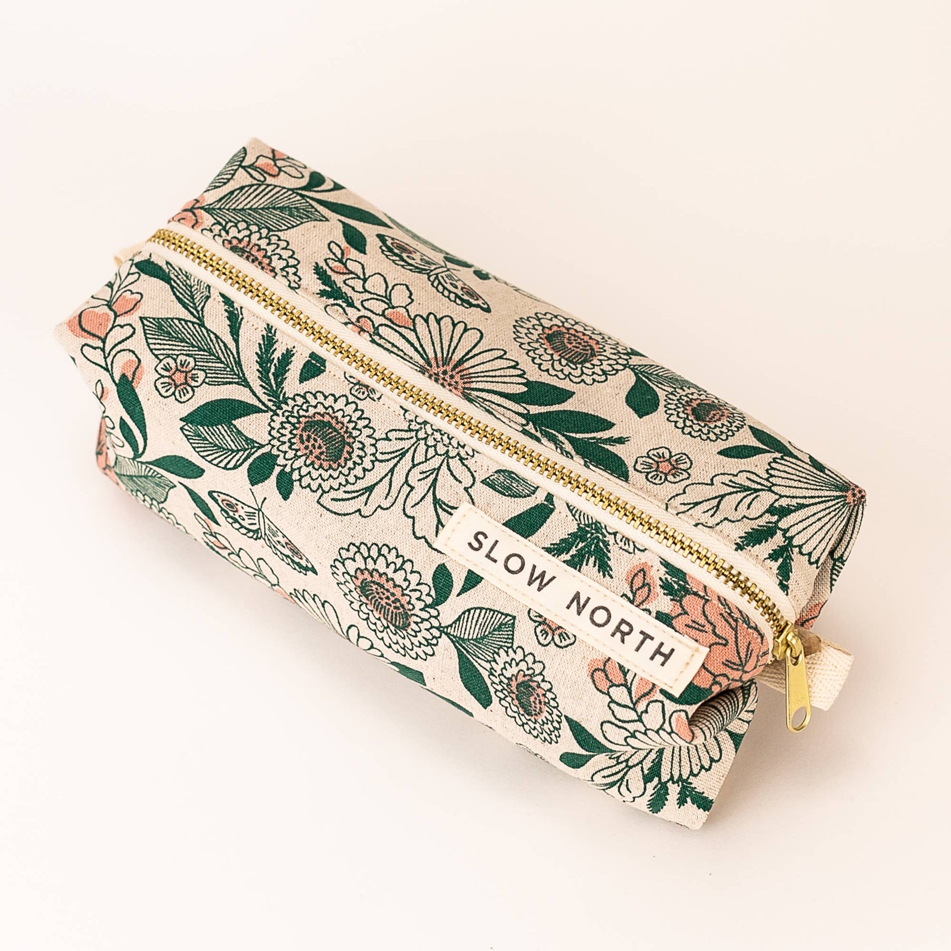 Keep your essentials organized with our durable travel pouch. This self-standing, structured bag is handmade with expert craftsmanship at Slow North's Austin studio. Each one is lined with heavy canvas and features an easy-access YKK brass zipper. A perfect little zipper bag to store anything from cosmetics and toiletries to stationery supplies. Dimensions: 4" wide x 8" long x 3.5" high Made with 100% cotton canvas. Wash cold + line dry.